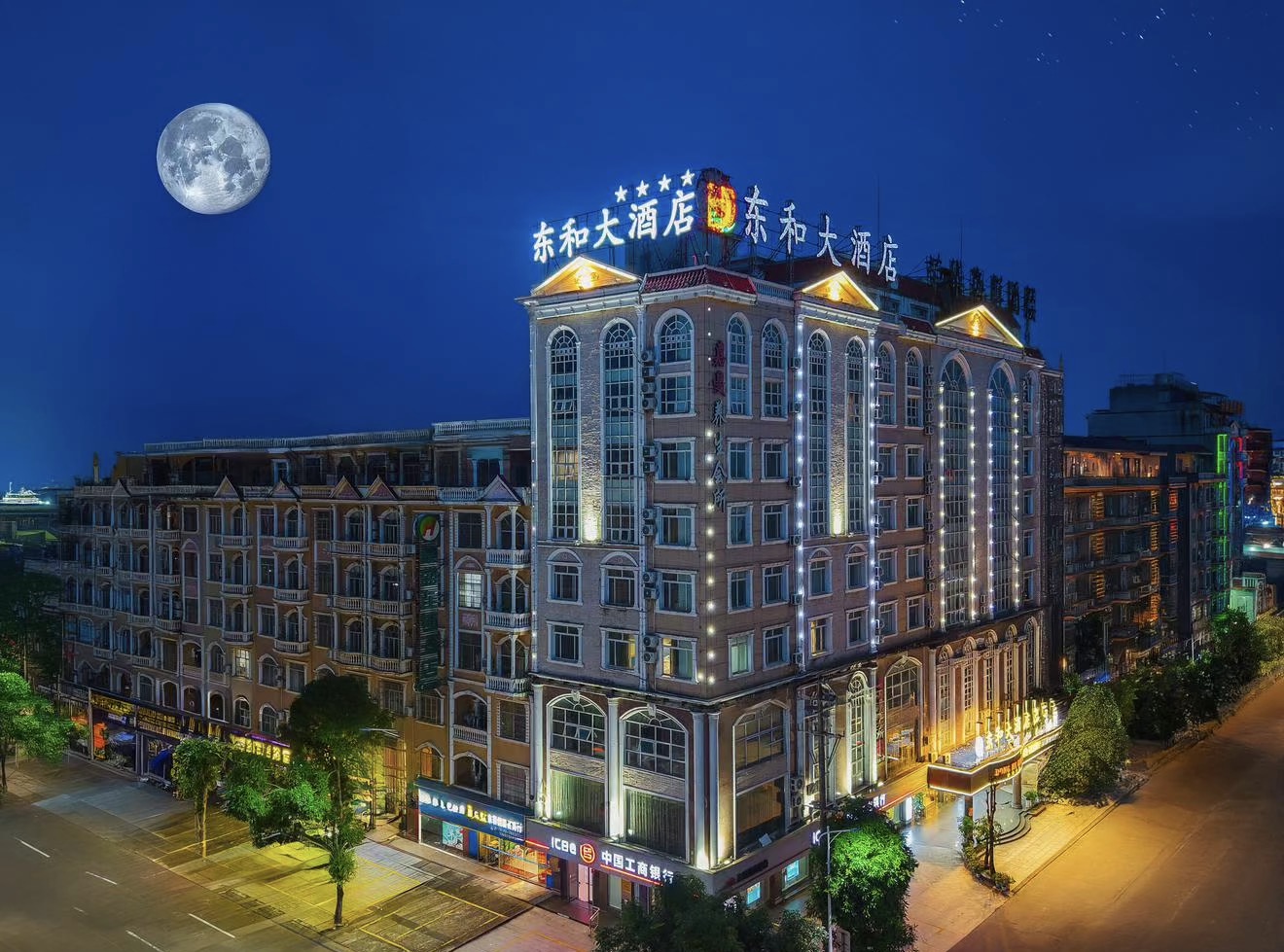 地理位置:酒店位于东兴市兴东路,毗邻东兴市政府、东兴市国税局,地处市中心地段,出行交通便捷。酒店是东兴市人民政府签约的投资建设项目,地面积4950平方米,建筑面积18500平方米(其中地下室2000平方米),分别由A、B两栋楼连体构成。东和大酒店还设有大型停车场是宾客商务出行、休闲度假的理想入住地。